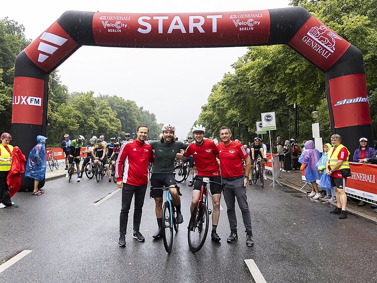 Kurz von dem Start der 60 Kilometer - v. l. n. r. Jan Dietrich (Generali Deutschland), Rick Zabel, Jens Voigt und Jürgen Lock (Geschäftsführer von SCC EVENTS) | © SCC EVENTS_Jean-Marc Wiesner