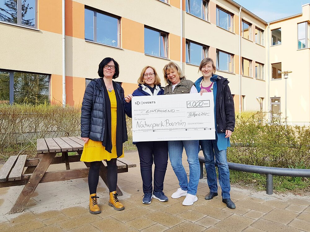 Yvonne Dankert-Schmidt (Dezernentin der Stadt Bernau bei Berlin), Astrid Huwe (Schulleiterin der Grundschule Schönow), Beate Kerkhofer (1. Vorsitzende Schönower-Heide-Verein e. V.) und Eva Roeder (Naturpark Barnim - zuständig für Bildung für nachhaltige Entwicklung) nehmen den Scheck entgegen (v. l. n. r.). © SCC EVENTS / Stadt Bernau